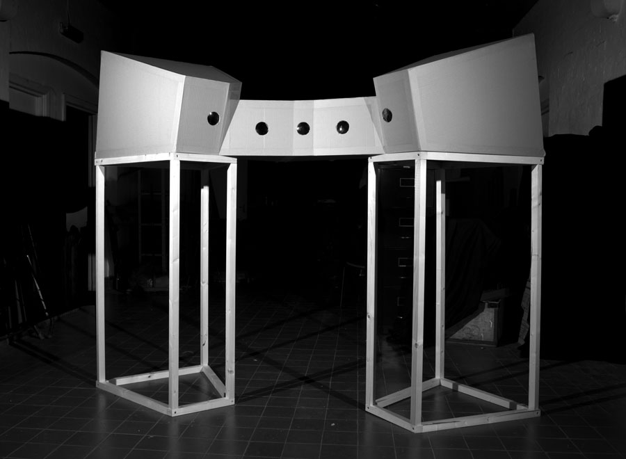 Using lo-fi analogue technology the multi-lens, cardboard cameras are used to make photographic images. These photographs emphasise the materiality of the sculptures as well as the material nature of the photographic process. A dialogue is set up between all three elements of the exhibition: the photographic image, the camera and the sculpture. |