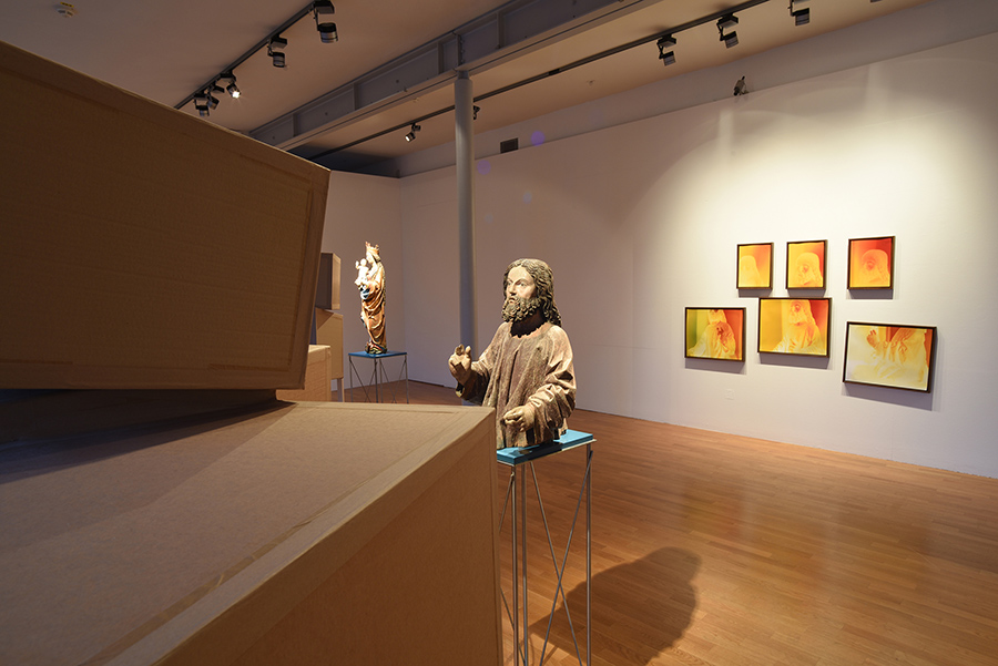 Rezension – Skulptur, Object, Apparat is the result of a three year period of research that has focused on a collection of late Gothic, painted, lime wood sculptures, made between 1440 and 1495, which are housed in the Strigel Museum in Memmingen, Bavaria. The project involved designing and building large cardboard cameras, which were then used to photograph the historic sculptures. The photographic apparatus becomes a sculpture in space. Along with the historical art objects the results of this experimental setup hang on the walls, the photographs that were taken with the cardboard, multi-lensed cameras. At the same time, we see the photographs and the objects they depict: the historic sculpture, the camera-sculpture and the resulting images. |